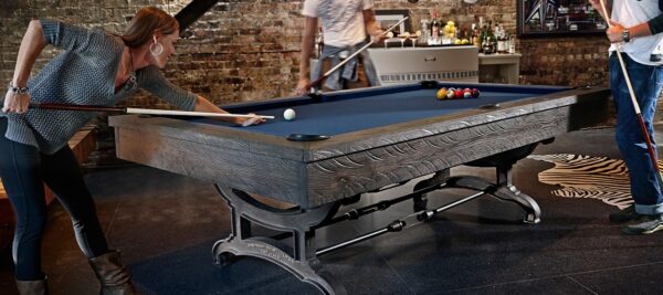 Combining rugged charm with an industrial, loft-style look makes the Birmingham a perfect choice for modern game rooms in need of a vintage touch. Featuring a distressed, rough-hewn finish with a cast iron decorative pedestal and turnbuckle stretcher element, the Birmingham is stylish and rustic down to the last detail.