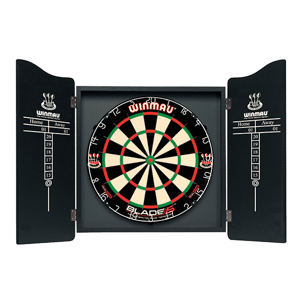 Features black background with cream and orange design. These deluxe, high quality veneer effect dartboard cabinets are suitable for all Winmau bristle dartboards. All cabinets are supplied in full color lithographic cartons and feature Home and Away easy-wipe scoring panels and magnetic closure system. Complete with fixing and fitting instructions. Dartboard and accessories sold separately.
