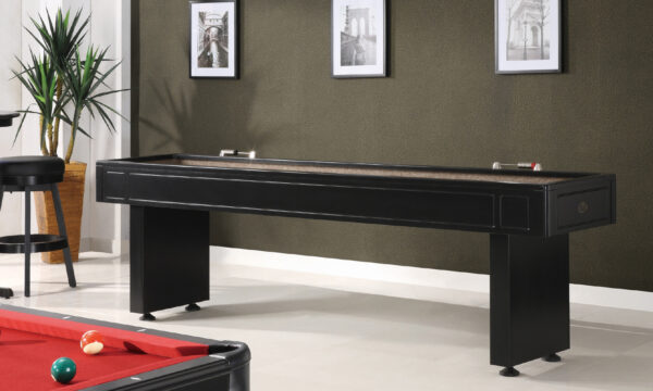 Accessories: Legacy shuffleboards include everything needed to play the game; includes four black pucks, four red pucks, stainless abacus scorer, table brush, wax and black table cover.