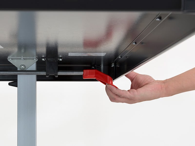 Just give the red handle a gentle pull upwards to unlock the safety mechanism. Then with the other hand pull down to open or push up to close. It’s that easy. The opening mechanism has safety features to help prevent a top from unexpectedly crashing down on anyone below