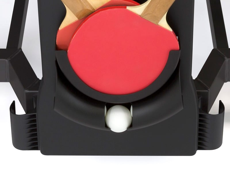 The table has storage on both sides holding 4 paddles and 18 balls.