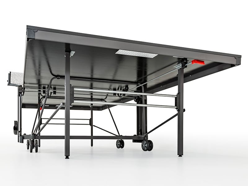 The Expo Indoor is a great-looking ping pong table that’s built to last. Made in Germany, the Expo can stand up to heavy play. The 3/4″ (19mm) multi-coated top is supported by thick metal tubing for extra strength. The frame features powder-coated metal that offers protection against wear and tear. The locking handle system makes it easy for one person to fold up the table and roll it into storage.